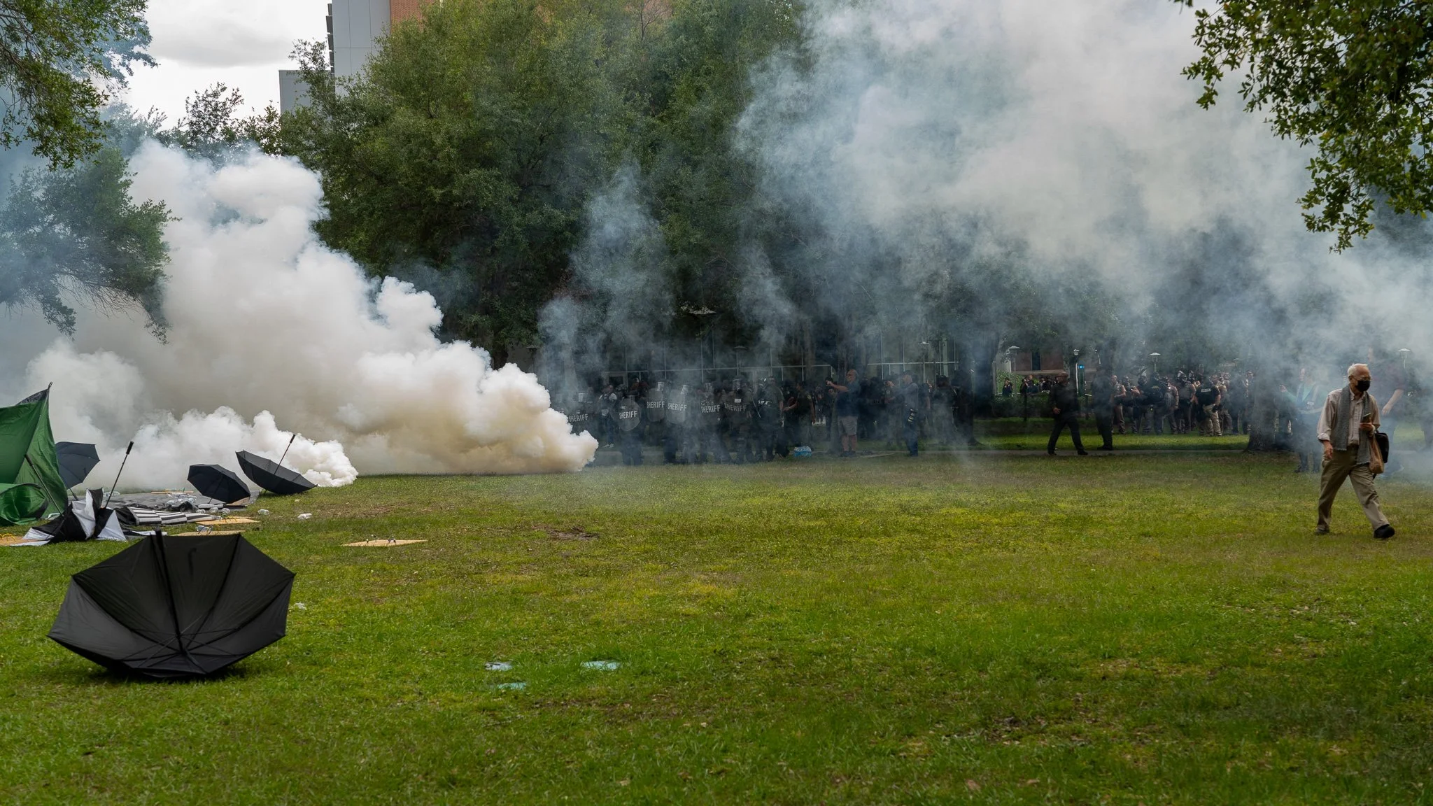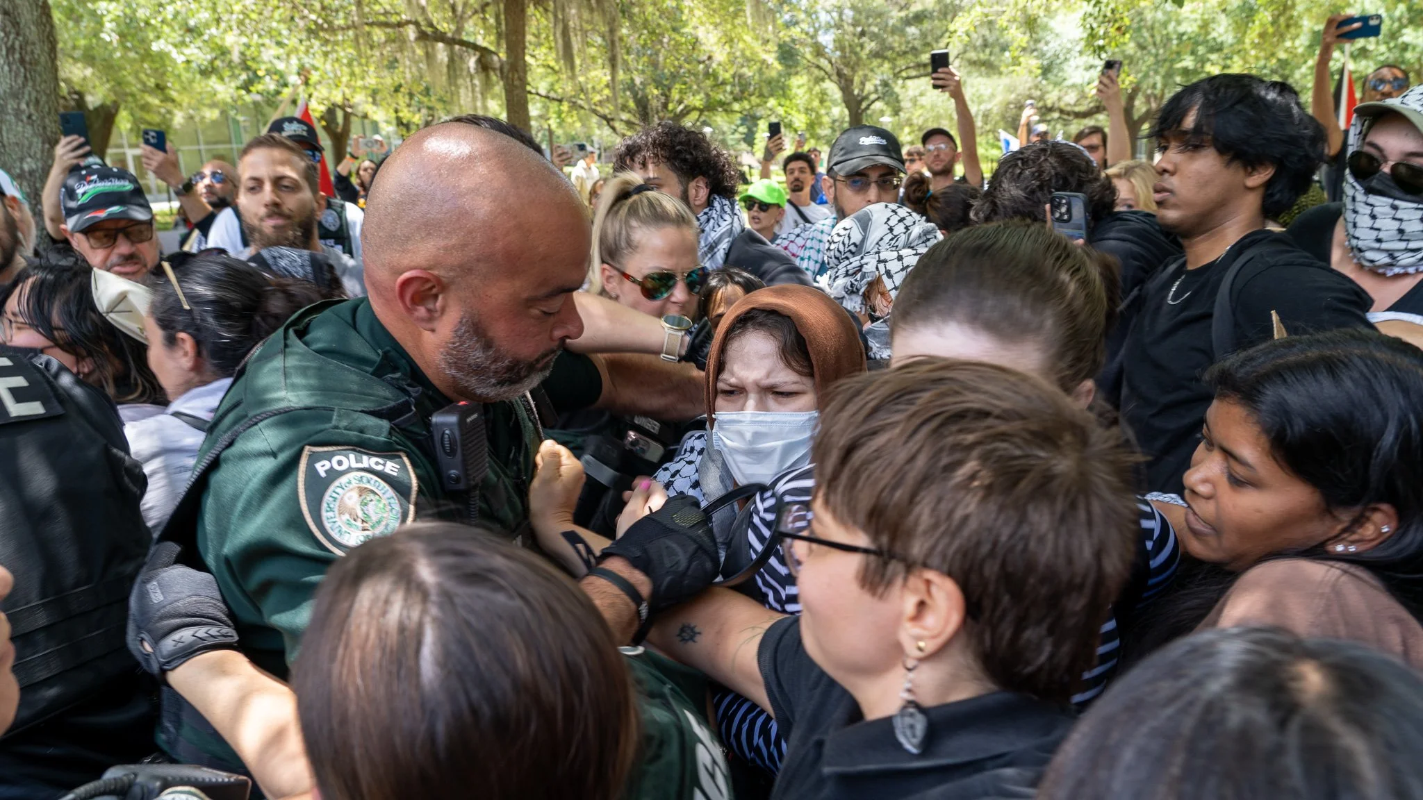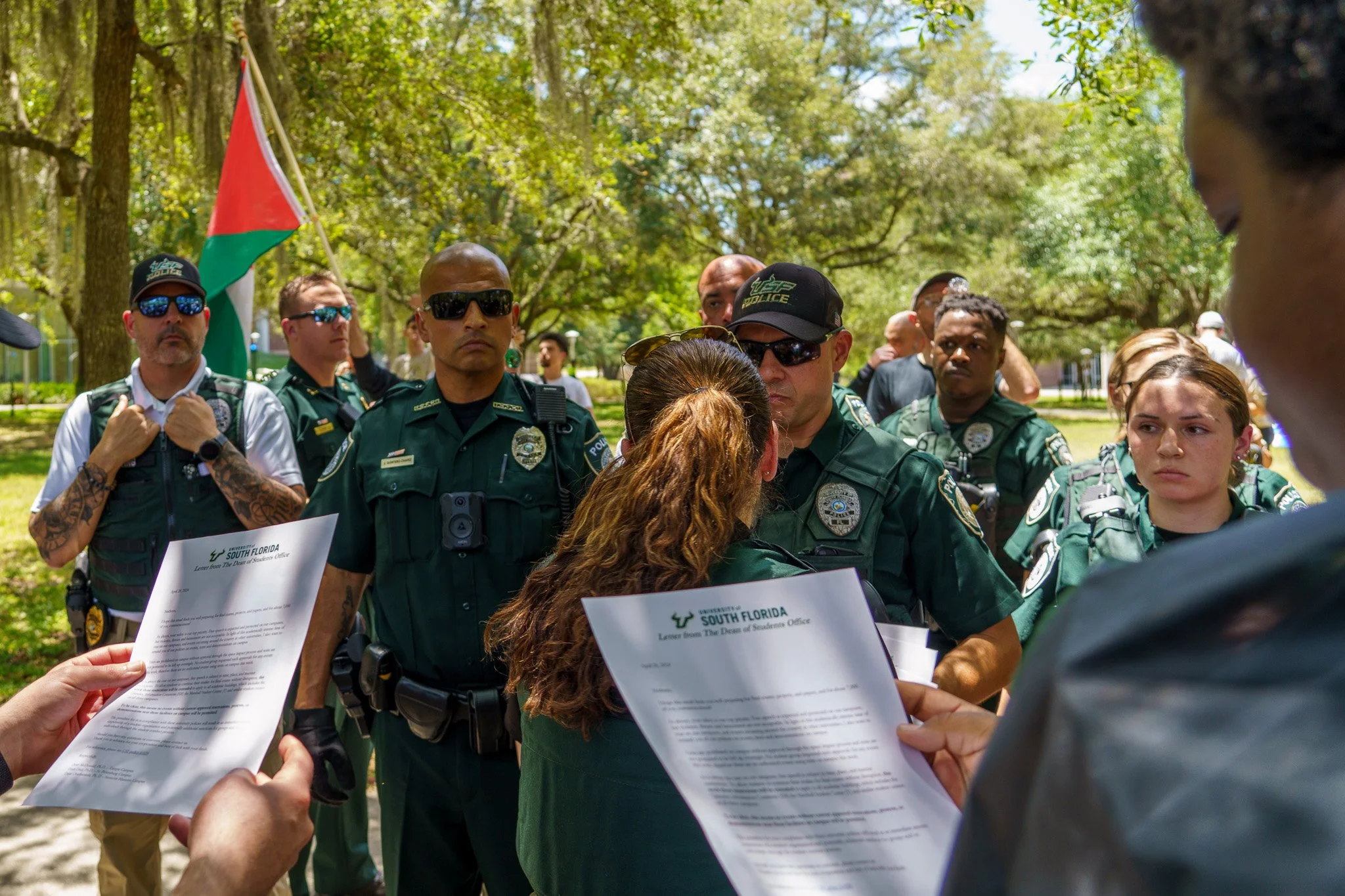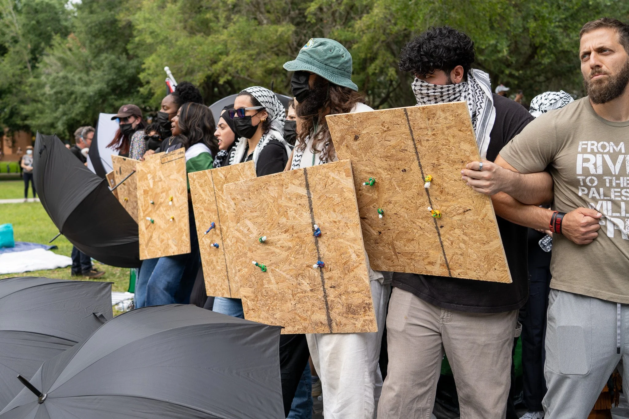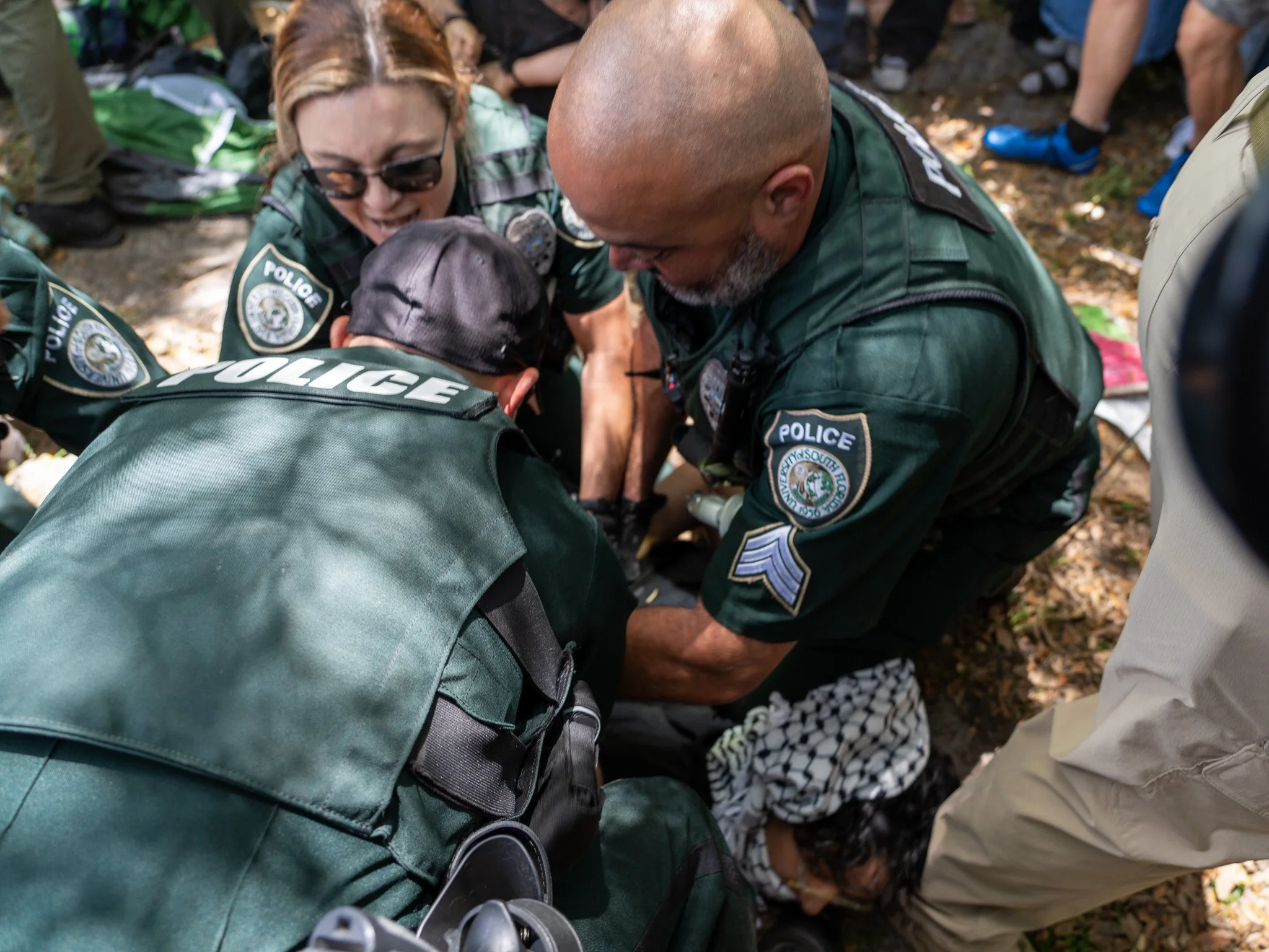 On April 29th students at the University of South Florida attempted to establish an encampment in solidarity with Gaza. As students attempted to assemble a tent university police immediately moved in to arrest students. Students attempted to form a protective circle which police broke through, ultimately arresting 3 people.